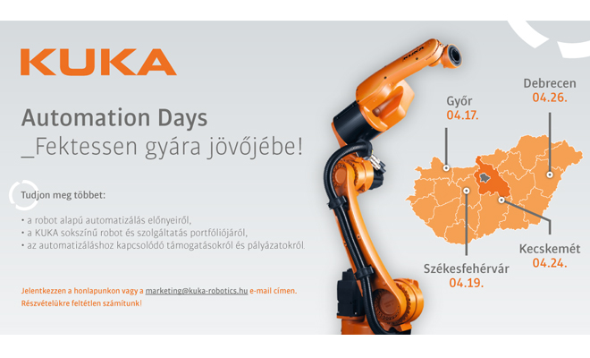 A KUKA Automation Days elnevezésű rendezvénysorozata alkalmával több helyszínre látogat el az országban, ahol szeretné megmutatni miért is érdemes már most befektetnie gyára jövőjébe. A folyamatosan fejlődő és bővülő piaci igények miatt az automatizálás előtérbe kerül, hiszen általa gyorsabban és hatékonyabban állítható elő minőségi termék. Ne szalassza el a lehetőség, hogy többet tudjon meg a robotalapú automatizálás előnyeiről és megoldásairól. Jelentkezzen Ön is rendezvényünkre!