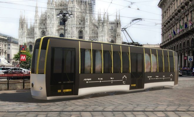 Még a villamos teteje is fontos része a dizájnnak, hogy Milánó erkélyeiről is lehessen látni azokat a dinamikus csíkokat, amelyek a 20. század eleji olasz futurista rajzokra emlékeztetnek. A mozgalom egyik jellemzője a sebesség dicsérete volt.