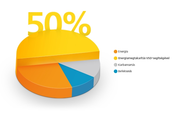 De milyen további megtakarításokkal számolhat az, aki a fenntartható energia mellett dönt? Nos, a sűrített levegő világában a felhasznált energiamennyiség csökkentésével komoly összegeket lehet megspórolni. A környezetbarát kompresszorok jelentősen kevesebb energiát használnak és mivel ezek az energiaköltségek adják egy kompresszor teljes élettartam-költségének túlnyomó részét, az ilyen költségcsökkentések számottevő mértékben megmutatkozhatnak az energiaszámlákon. Az Atlas Copco változó fordulatszámú (VSD+) termékei megbízható módon csúcsminőségű levegőt biztosítanak, miközben akár 50%-kal csökkentik az energiafogyasztást a fix fordulatszámú kompresszorokhoz hasonlítva, ezzel pedig vállalatunk az egyik legenergiahatékonyabb árucsaládot kínálja a piacon.