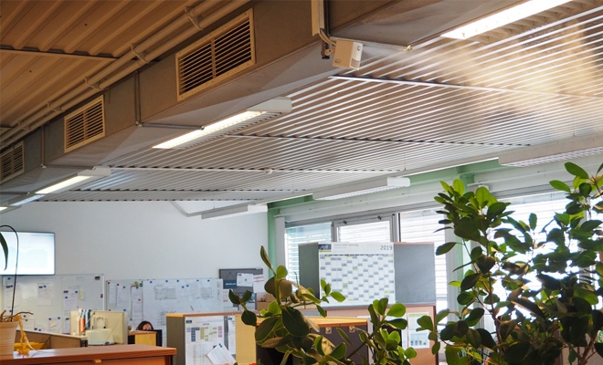 Az alkalmazott direkt helyiség párásítással minden munkaterületen célzottan optimális, 40-45 % páratartalmat biztosítanak, azóta nincs panasz a túl száraz levegőre. Az egészséges, egész évben állandó helyiségklíma garantálja a munkavállalói elégedettséget és a kellemes munkakörnyezetet.