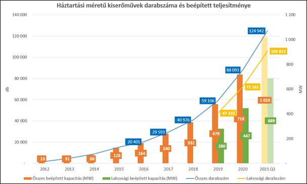 2021 harmadik negyedévében 8657 darab háztartási méretű kiserőmű (HMKE) csatlakozott újonnan a hálózatra összesen 77,67 MW beépített teljesítménnyel. A Magyar Energetikai és Közmű-szabályozási Hivatal adatai szerint a HMKE-k összteljesítménye szeptember végére elérte az 1024 MW-ot.