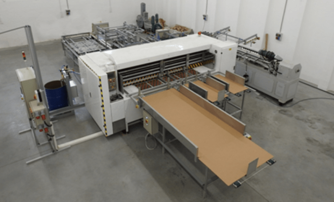 - Hajtogató és ragasztó: a megmunkált alapanyagot a hajtogató gép több fázisban hajtogatja a megfelelő formára, szakaszonként üzemeltetve az egyedi fejlesztésű hotmelt felhordó egységet. A hajtogató kész formára készíti a raklap borítást.