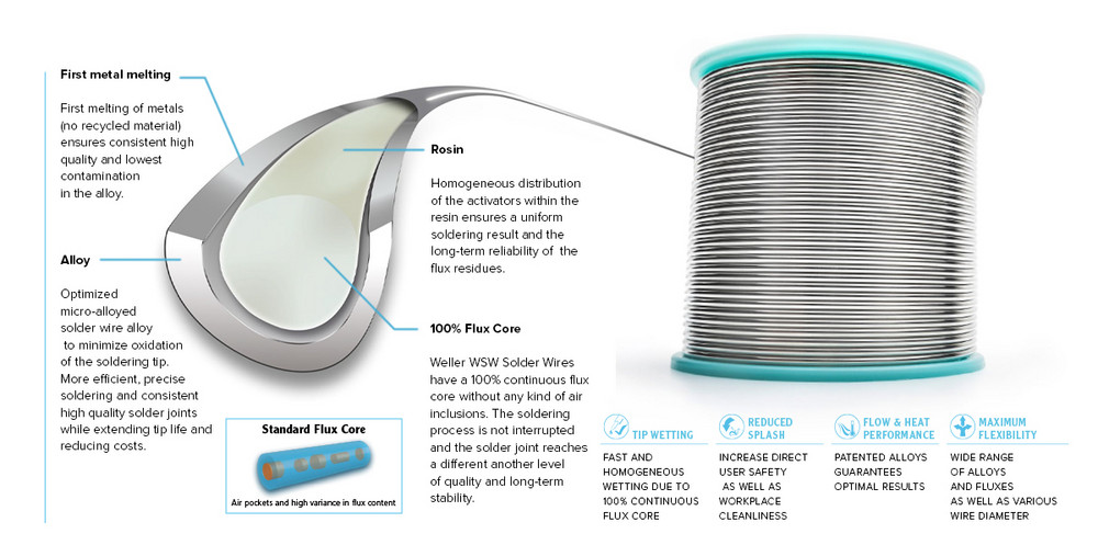 A Weller WSW sorozatú forrasztóhuzalok minden eddig említett nehézségre megoldást kínálnak. A gyártó mindenekelőtt garantálja a folyasztószer homogenitását a magban. A mikro repedések és egyenetlenségek nélküli, folyasztószeres, száz százalékig egynemű mag biztosítja a szabályos huzalolvadást és a problémamentes használatot, például automata huzaladagolóknál.