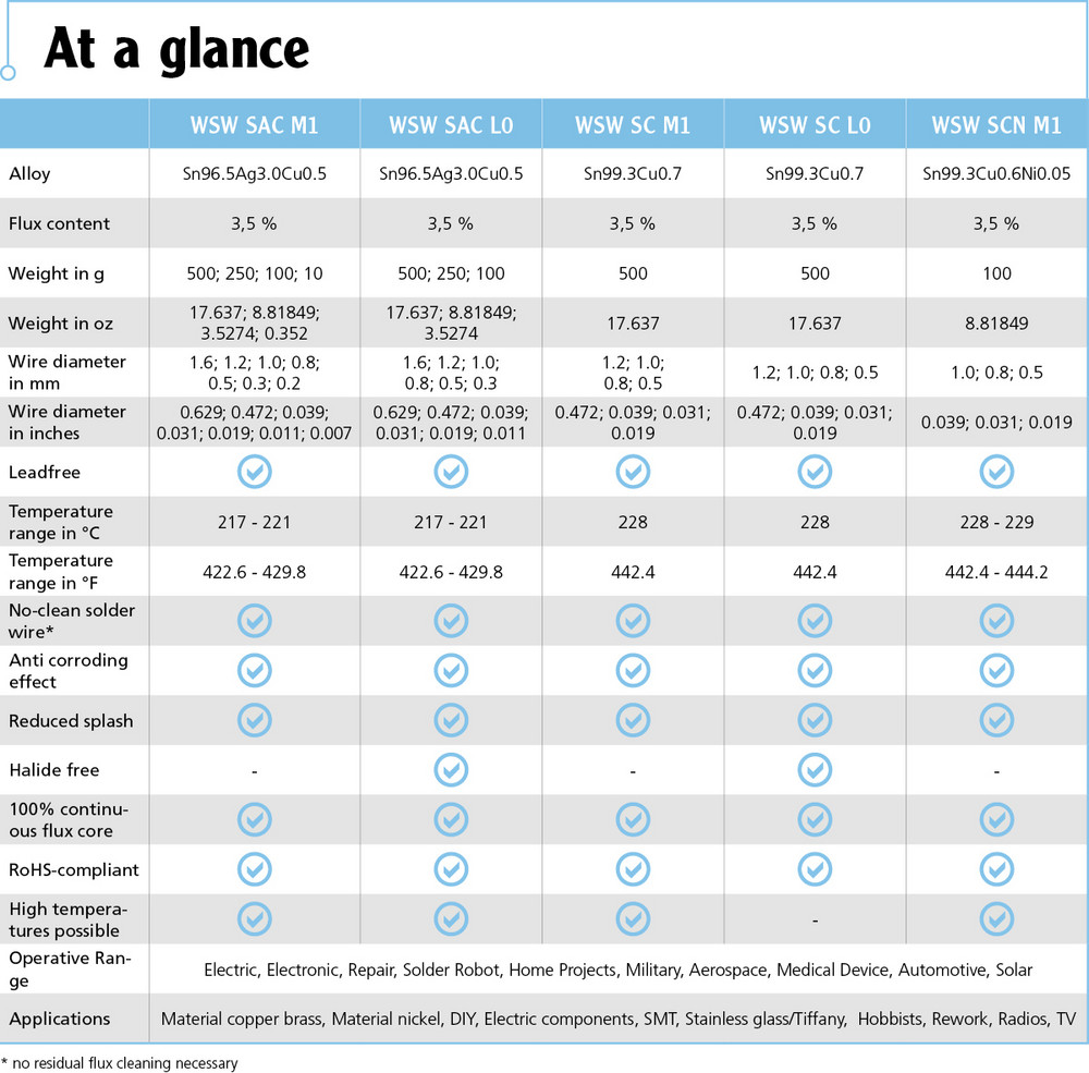 A táblázat a WSW Weller sorozatú forrasztóhuzalok elérhető típusainak és változatainak jellemzőit foglalja magába. Valamennyi típus a „no clean“ osztályba tartozik.
