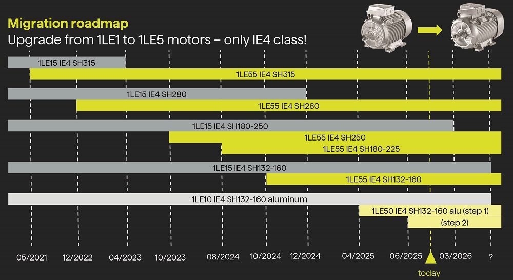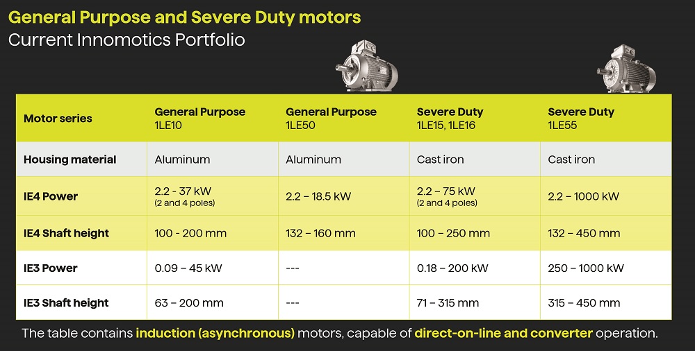 Ennek megfelelően az INNOMOTICS fokozatosan kivezeti az 1LE1 motorcsaládot, és helyette az új 1LE5 platformot vezeti be. Az új generáció számos műszaki előnyt kínál: javul a hatásfok és a teljesítménytényező, optimalizáltabbak az indítási jellemzők, valamint alacsonyabb zajszint érhető el. Emellett a konstrukció bővített opciókat kínál, például 6- és 8 pólusú kiviteleket, illetve 690 V-os szigetelési rendszert, ami növeli a felhasználási lehetőségek körét.