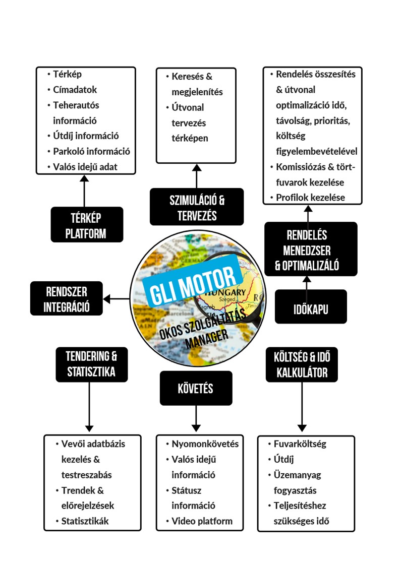 A rendszer alkalmas arra, hogy bővítés esetén további funkciók épüljenek bele, egyéb társrendszerekkel integrálódjon (pl.: vállalatirányítási rendszer), oda adatokat publikáljon, vagy használjon fel, ezzel segítve a felhasználó napi munkáját. A GLI Solutions fuvarszervező megoldása használható belföldi- és nemzetközi fuvarszervezésre egyaránt. Helyi megoldásunk alapja Magyarország térképünk, globális megoldáshoz partnerséget veszünk igénybe